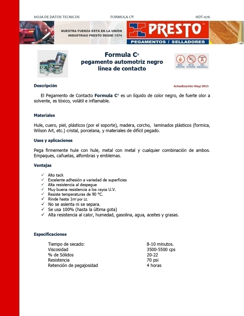 El Pegamento de Contacto Formula C es un liquido de color negro, de fuerte olor a solvente, es toxico, volatil e inflamable.