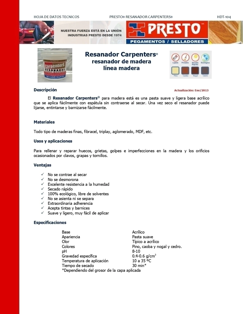 El Resanador Carpenters para madera esta es una pasta suave y ligera base acrilico que se aplica facilmente con espatula sin contraerse al secar. Una vez seco el resanador puede lijarse, entintarse y barnizarse facilmente.