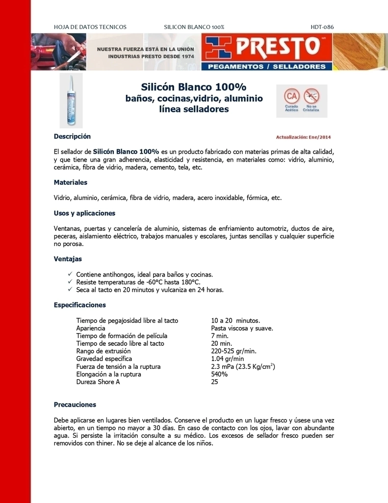 El sellador de silicon Blanco 100% es un producto fabricado con materias primas de alta calidad, y que tiene una gran adherencia, elasticidad y resistencia, en materiales como: vidrio, aluminio, ceramica, fibra de vidrio, madera, cemento, tela, etc.