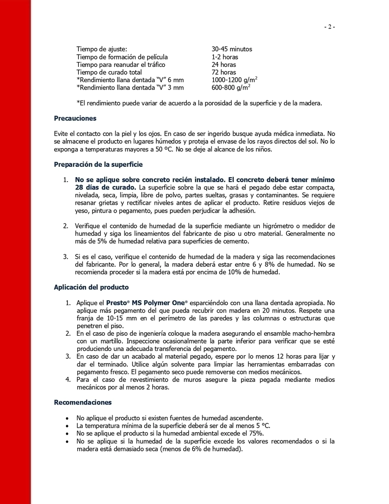 Presto MS Polymer One se utiliza para la instalacion de pisos en zonas residenciales, zonas comerciales de alto trafico, pisos con calefaccion, revestimiento de muros y la construccion en general.